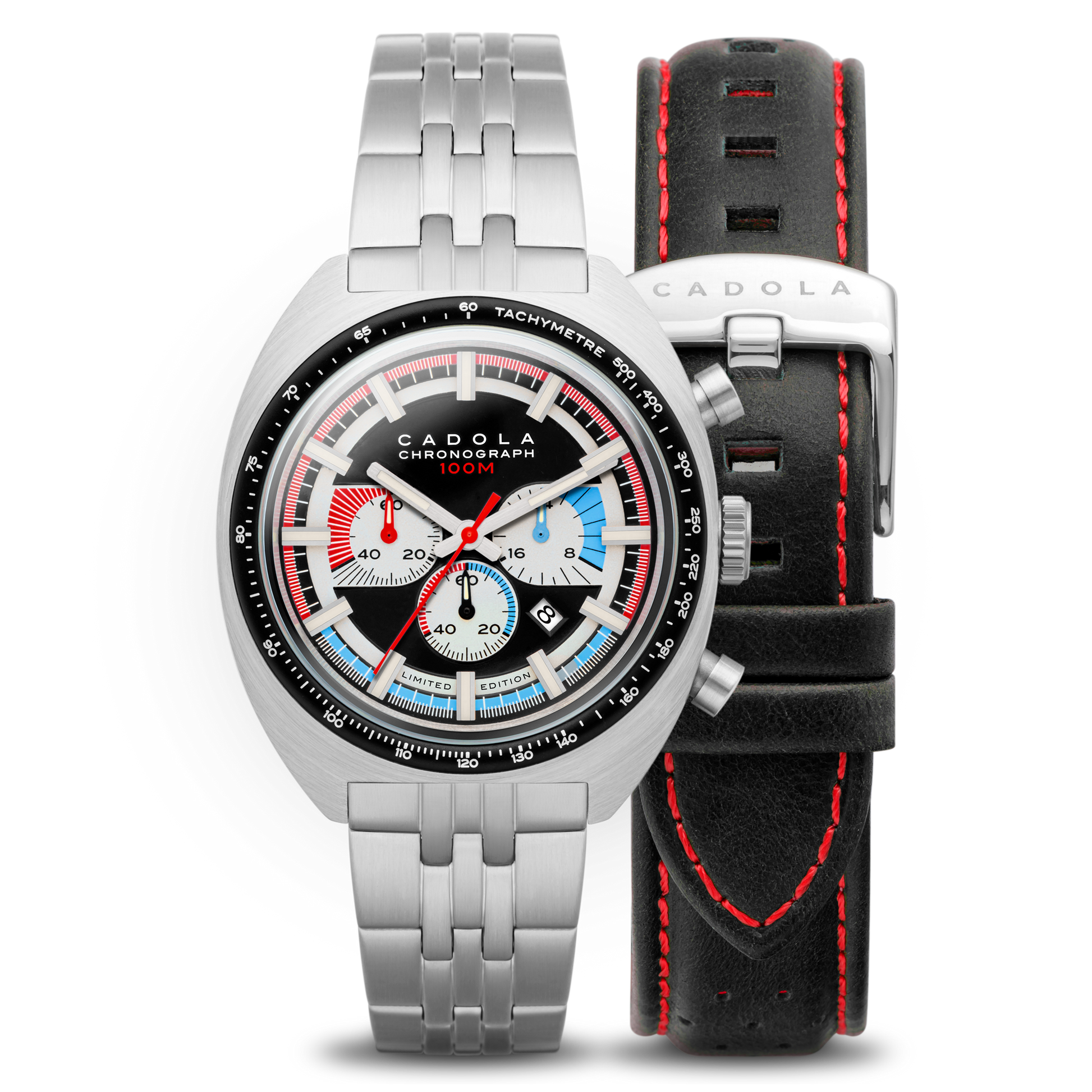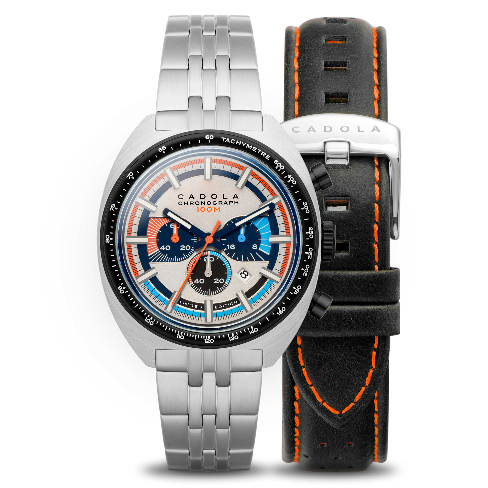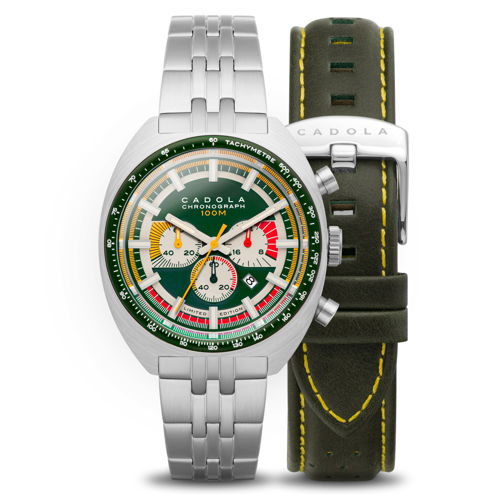Classically formed, 1977 is an apt and stylishly designed chronograph timepiece inspired by the dynamic times and spirit of 1970s motorsports. A limited-edition timepiece of only 77 pieces the watch comes with an additional genuine leather strap for added versatility and added motor-inspired flair.