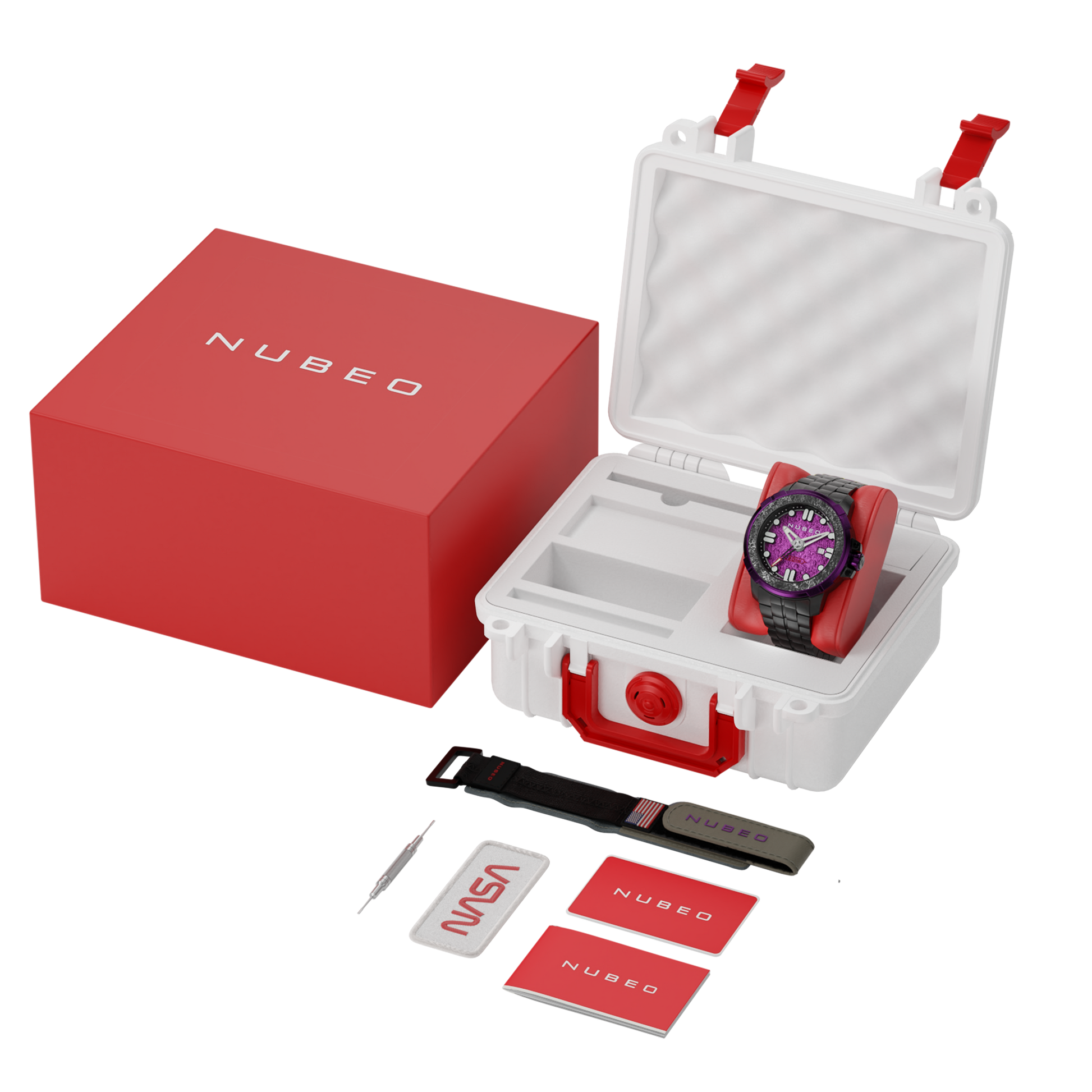 The moon-inspired forged bezel captures the essence of NASA's lunar exploration. The Apollo Automatic Limited Edition embodies endurance, character, and meticulous detail, celebrating a groundbreaking moment in our understanding of the Universe. Its case back features an authentic lunar meteorite. With an additional nylon strap, this timepiece offers comfort and versatility in any situation.