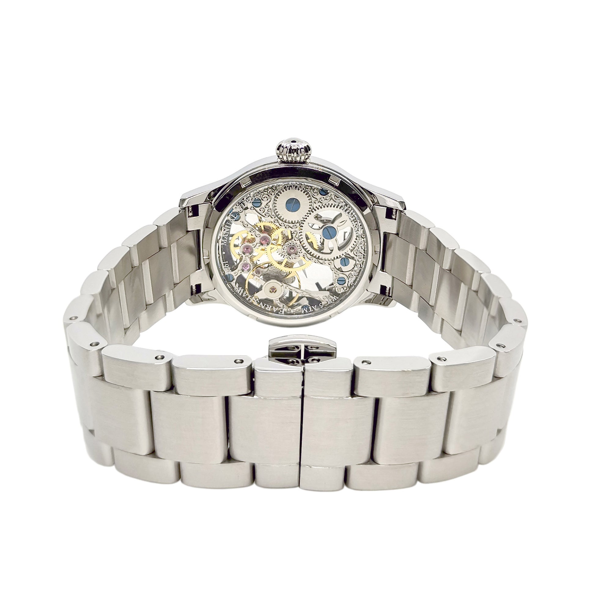 With a gently curving 42 mm diameter case that carries a domed lens, the watch gives witness to the intricate machinery of the hand-wound movement that powers the elegantly finished hour and minute faceted hands.