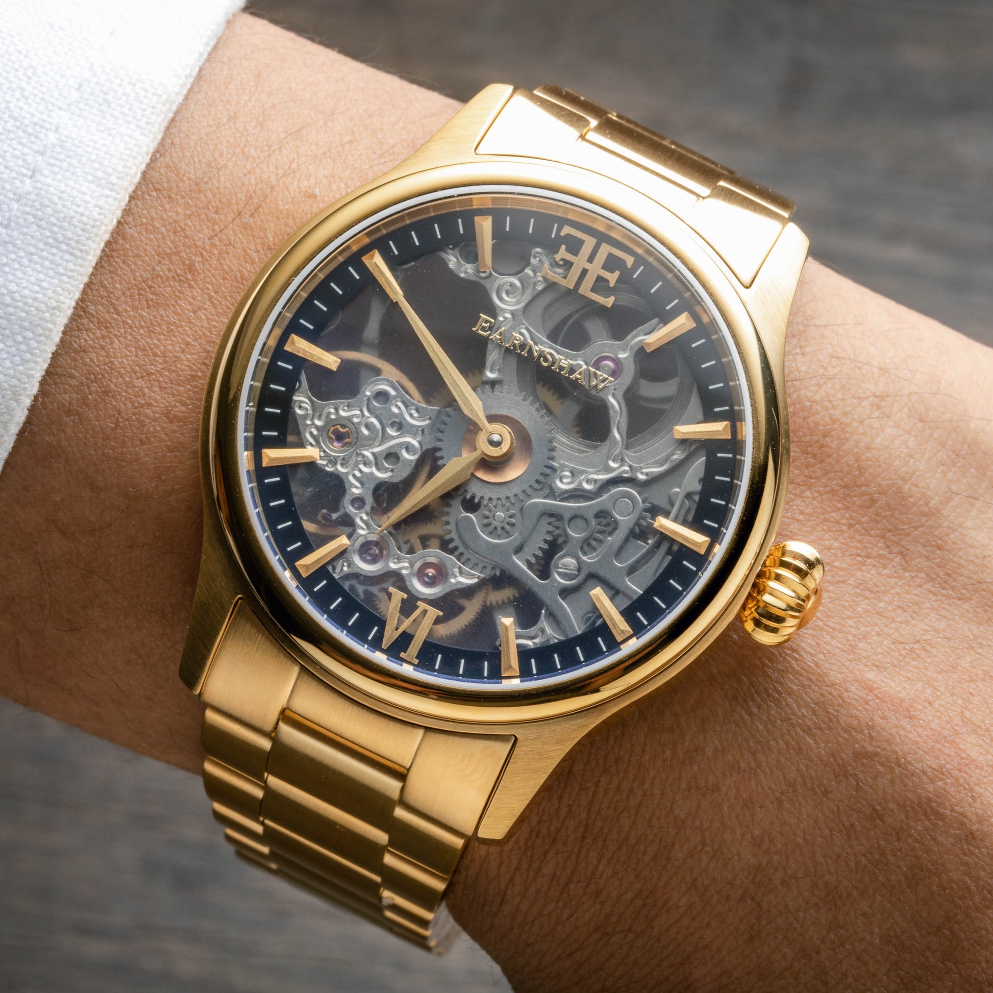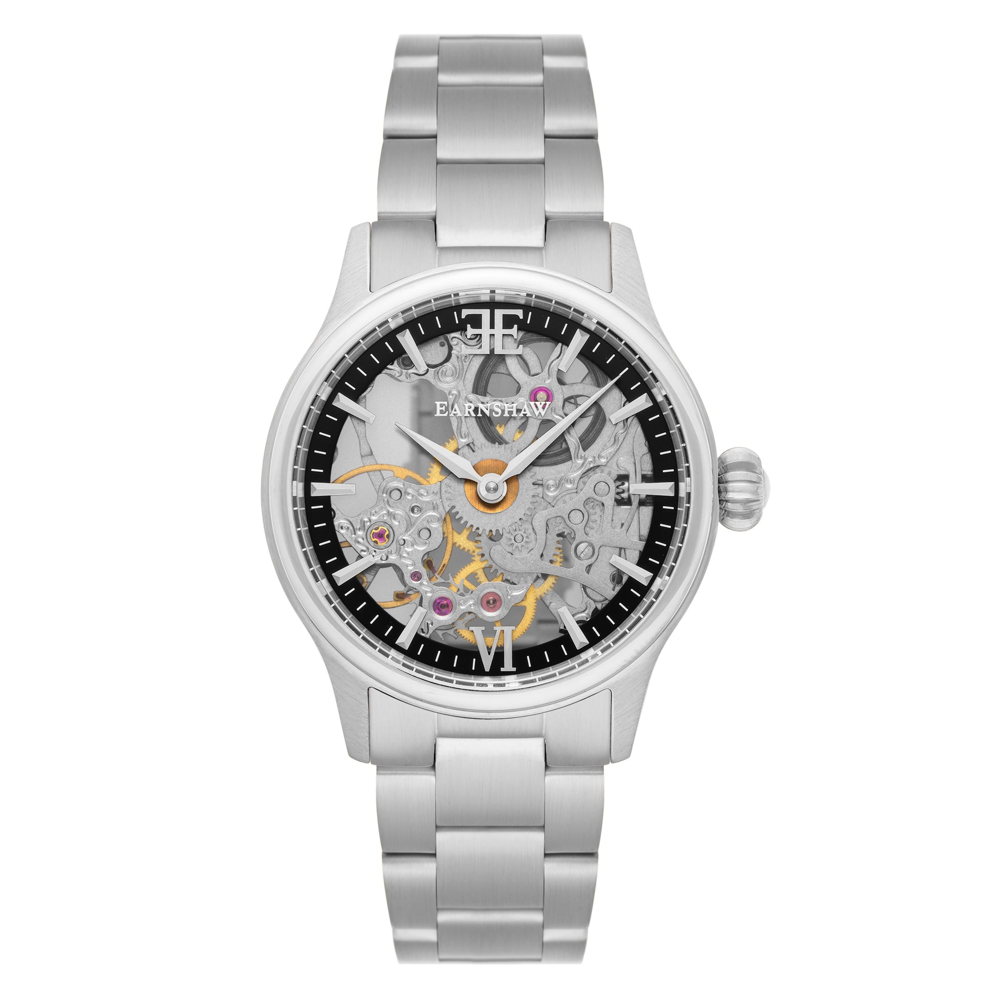 Beneath the hands, a translucent film stands as the dial which is framed with faceted baton indexes. The famed double E logo and the roman numeral six create room and space for the movement to take center stage while still making for a classically infused timepiece.