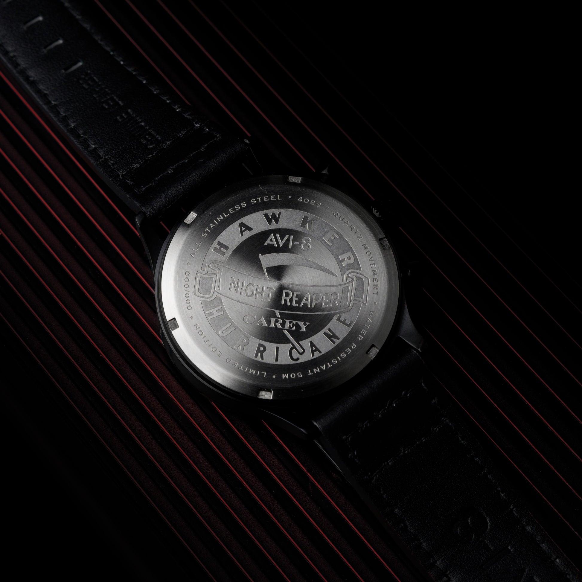 The Night Reaper Limited Editions represent a unique set of watches in the AVI-8 Hawker Hurricane family. These timepieces feature a striking design with a deep black colour scheme that pays homage to the legendary Hurricane JX-E (serial BE581) flown by Kuttelwascher, incorpor