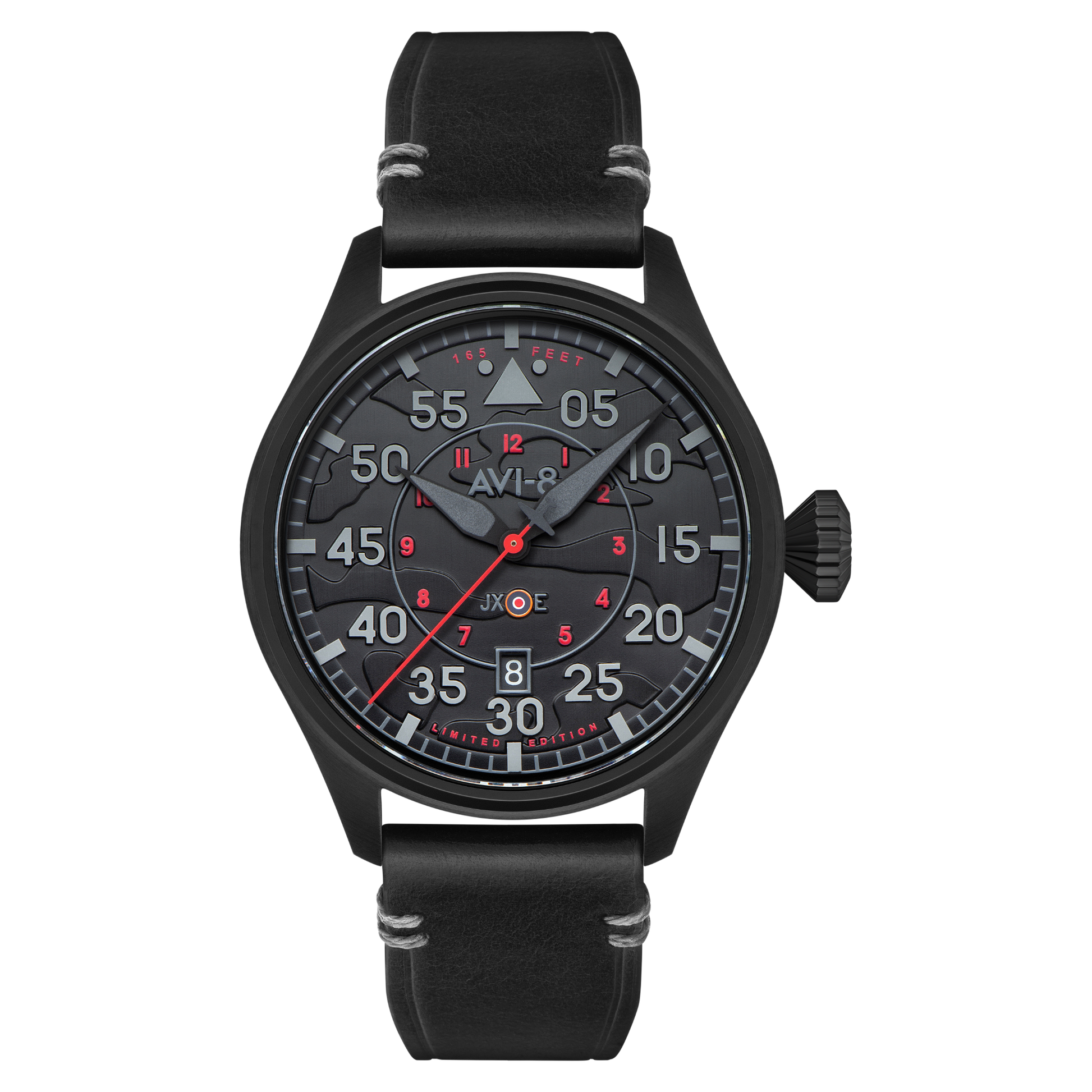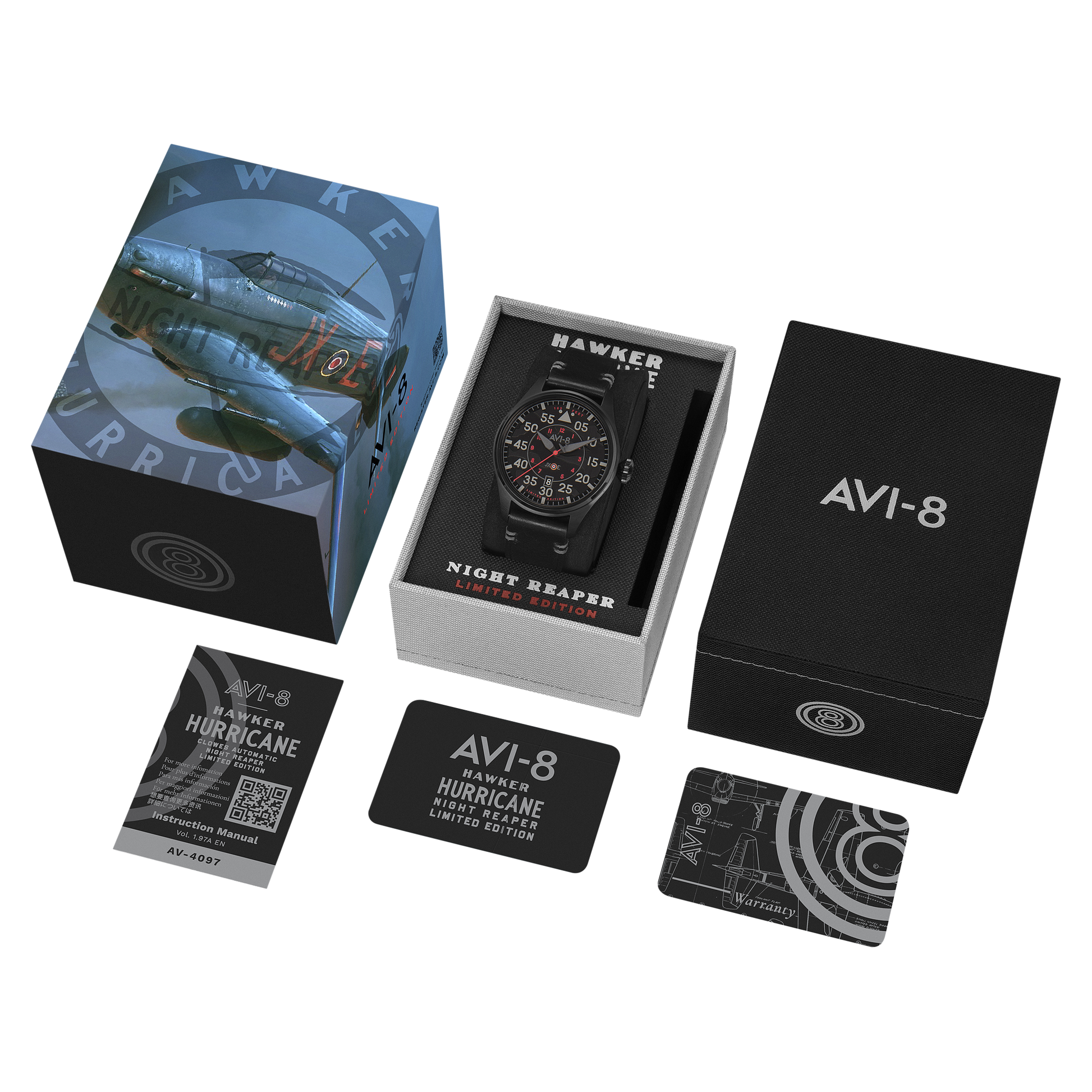 The Night Reaper Limited Editions represent a unique set of watches in the AVI-8 Hawker Hurricane family. These timepieces feature a striking design with a deep black colour scheme that pays homage to the legendary Hurricane JX-E (serial BE581) flown by Kuttelwascher, incorporating a distinctive camouflage pattern.