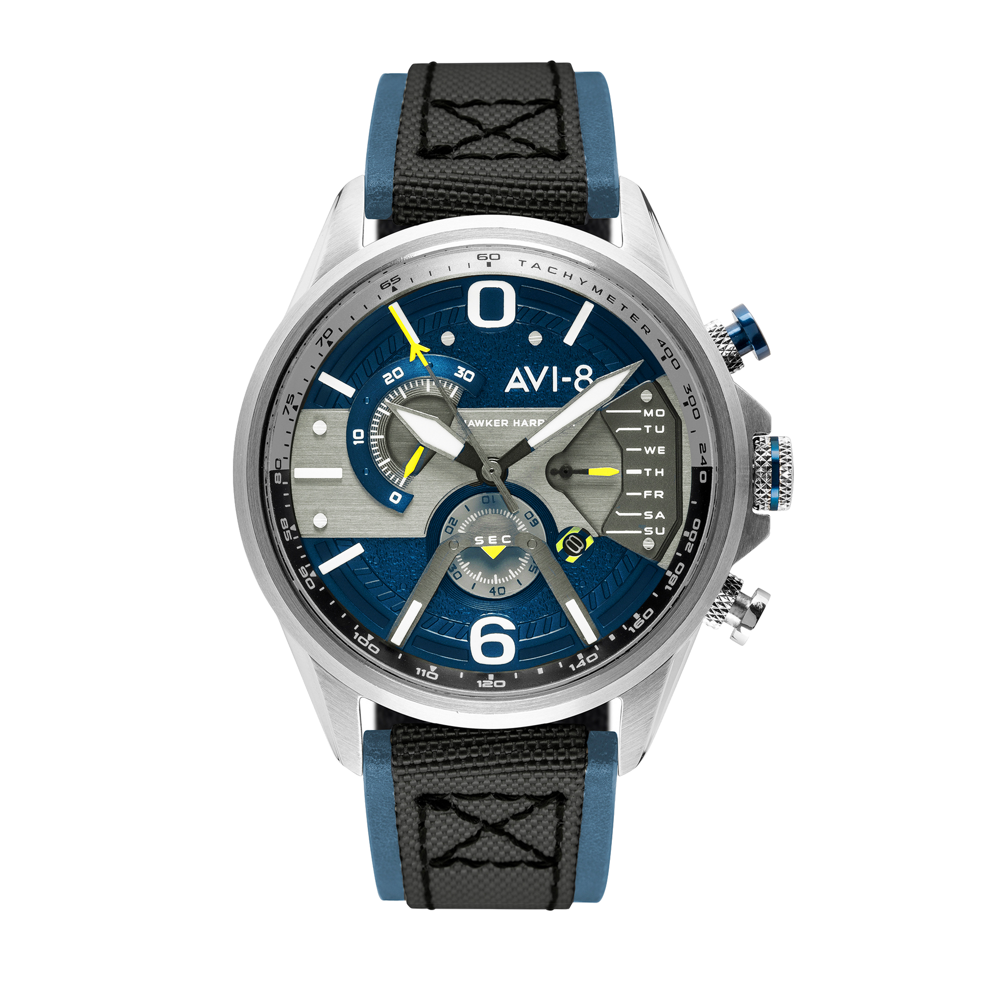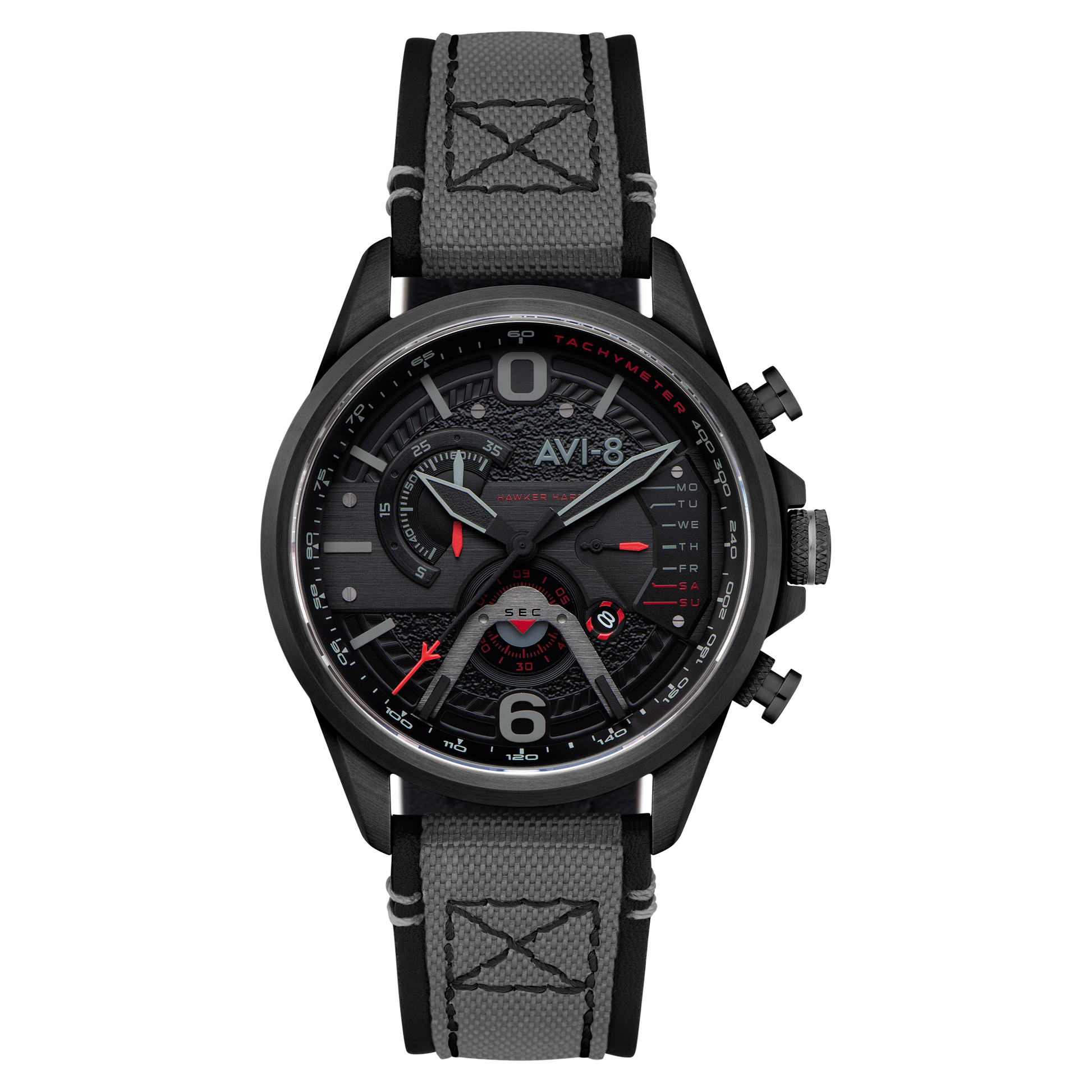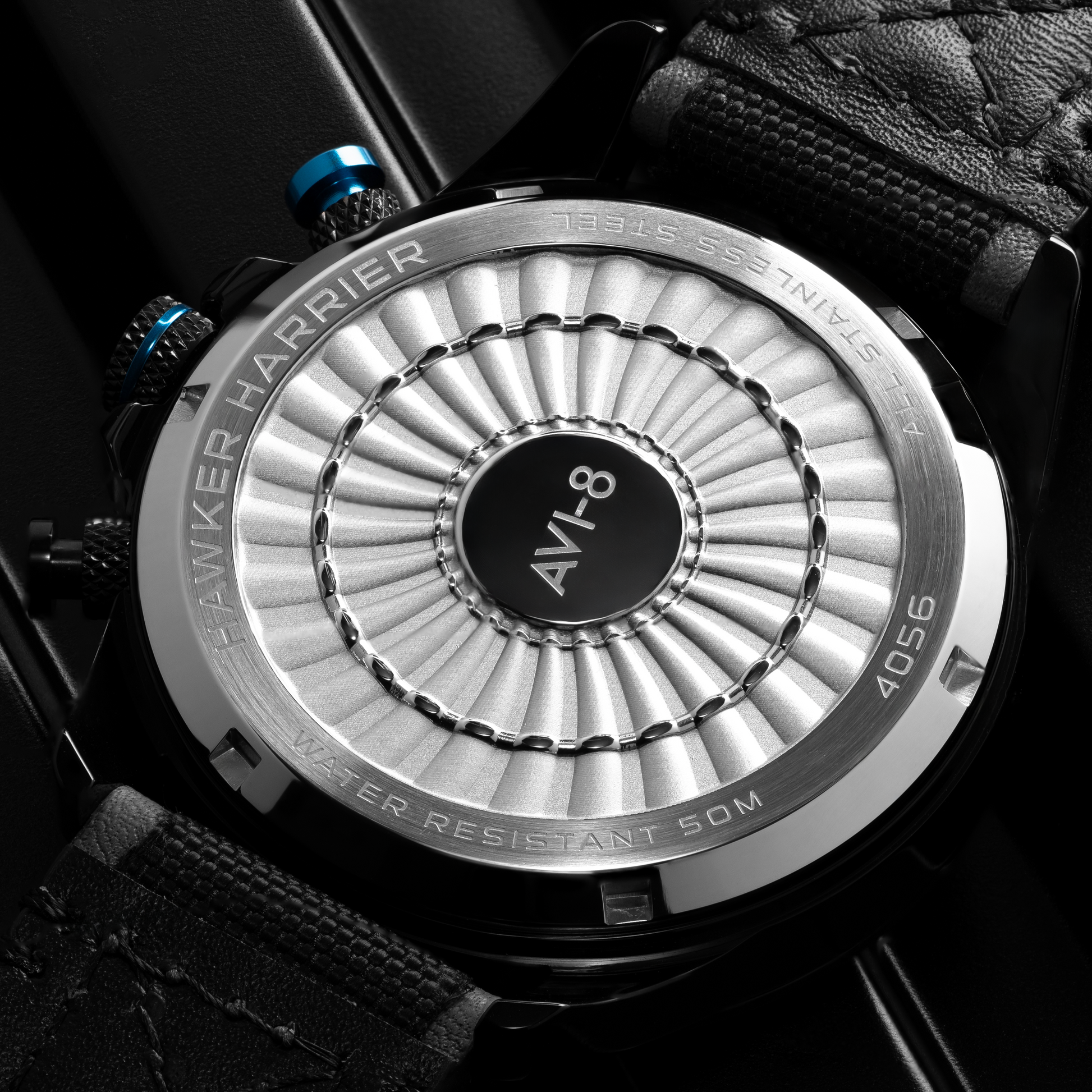 In the annals of aviation history, perhaps no fighter plane stirred as much controversy, excitement and technological wonder as the Hawker Harrier “Jump Jet”, which flew for the Royal Air Force and for the US Air Force during the latter part of the 20th century. This incredible aircraft, powered by the famed Rolls Royce Pegasus series of engines provides the aesthetic backdrop for Hawker Harrier II Dual Retrograde Chronograph timepieces.