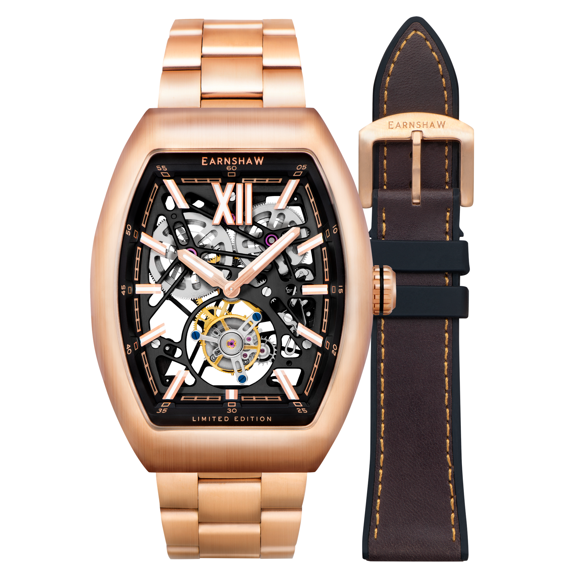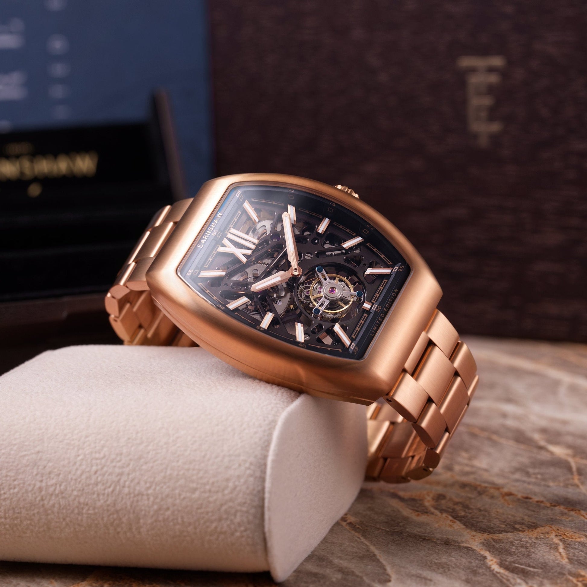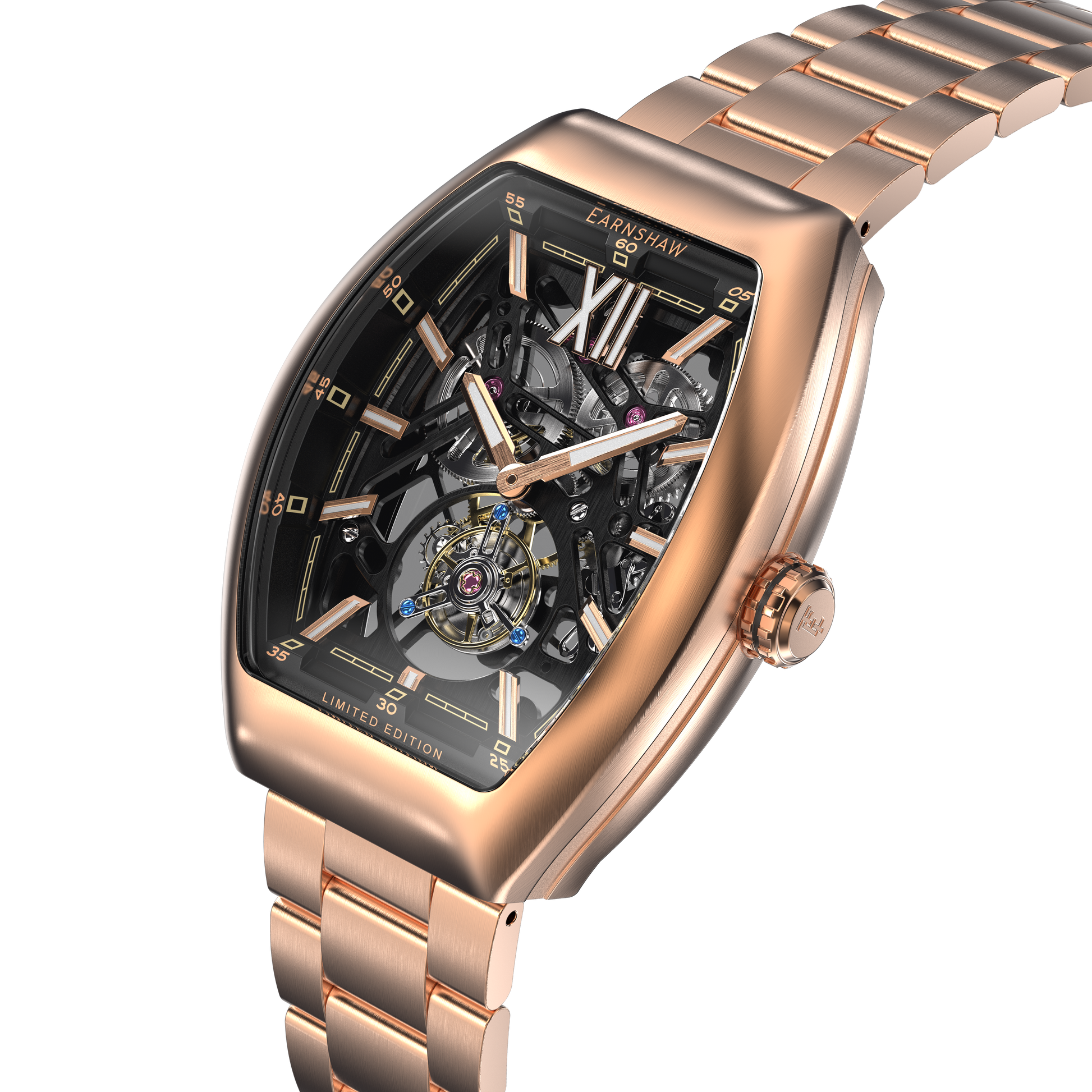 A truly special timepiece. The Supremacy Tourbillon Limited Edition is a timepiece guaranteed to captivate, to inspire and to ignite a passion and intrigue for timekeeping. A bold tonneau case houses a state of the art tourbillon hand crafted and assembled by our own master watchmakers keeping alive the legacy, the spirit of the Earnshaw name with a timepiece that is limited in numbers, in quantities available but unlimited in its ambition and power. A limited edition of only 64 pieces manufactured for purchase worldwide. Each timepiece is uniquely numbered.